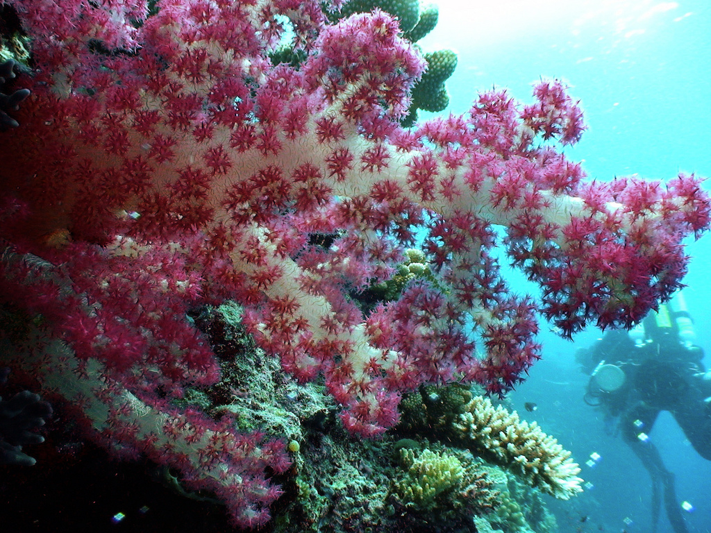 Há também paredes multicoloridas de corais moles e esponjas, gorgônias com crinóides são abundantes. Não são apenas os recifes que tornam este local especial, pois no mesmo dia (as vezes no mesmo mergulho) você pode fazer drift dives em fortes correntes, mergulhar em um naufrágio e em uma caverna. Há mergulhos para todos os tipos de aventureiros.